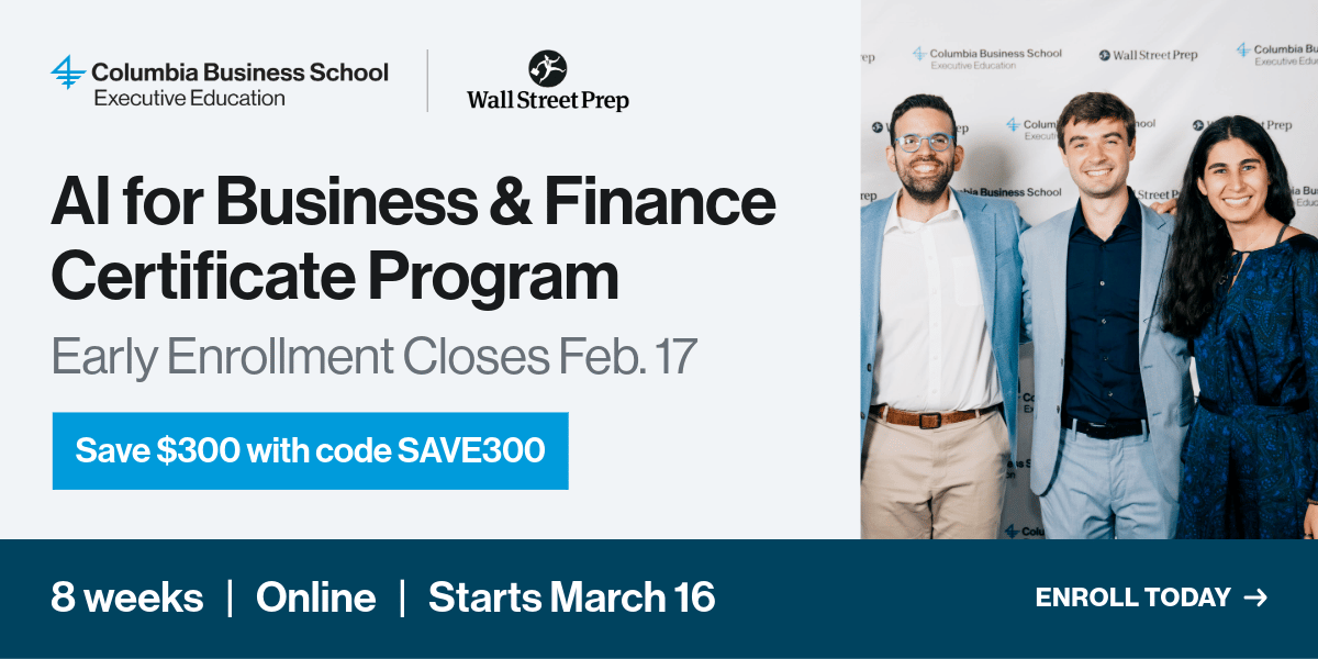 The AI for Business & Finance Certificate Program from Columbia Business School Exec Ed and Wall Street Prep draws on real-world examples inspired by how firms like BlackRock, Citi, and Morgan Stanley approach AI enablement for their teams.